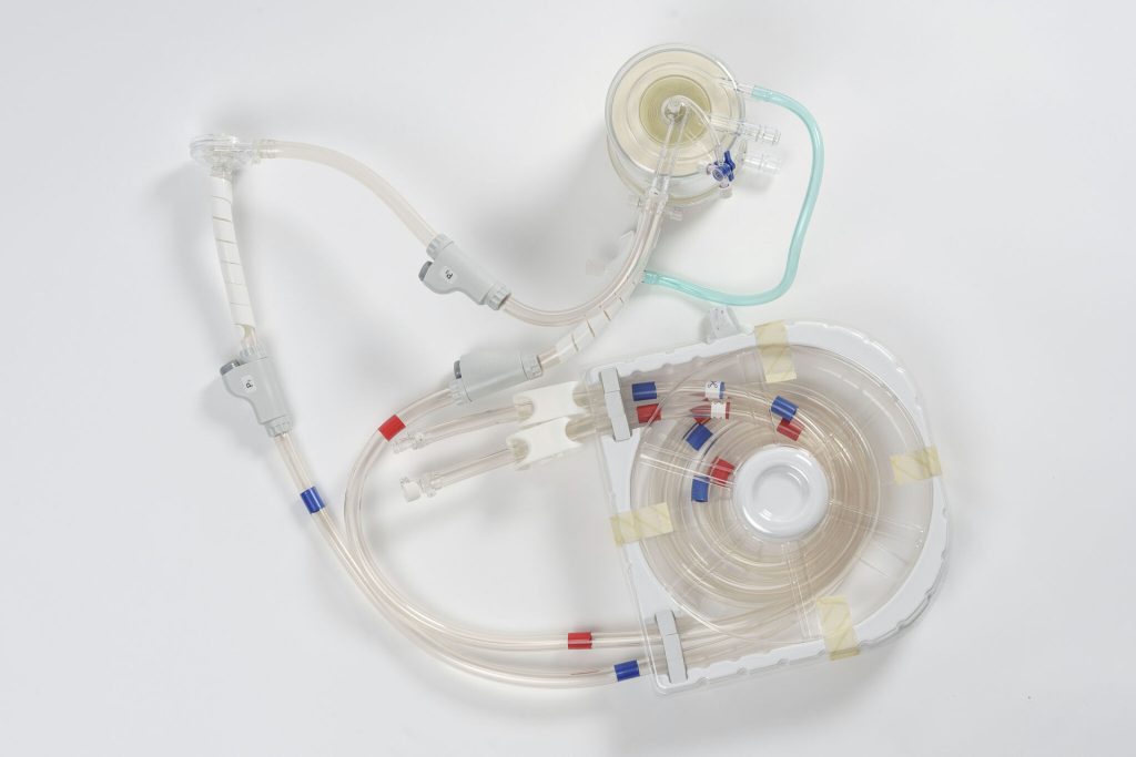 Top view of the Extra Corporeal Membrane Oxygenation circuit with arterial and venous lines organized to minimize space and risk of error during setup, an aspect that affects the safety of procedures and the integration of the system into the daily workflows of intensive care units (Photo: Lifemotion)